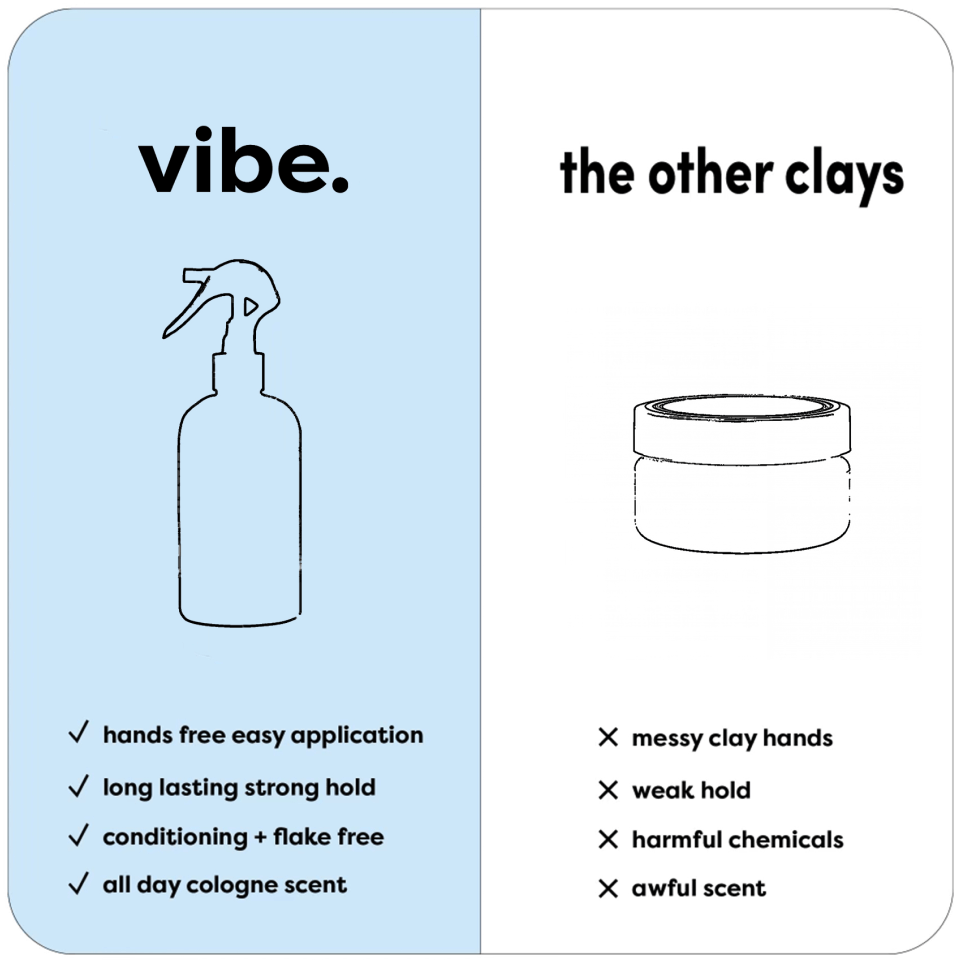 sure, you've already got a hair product you use daily. although, vibe spray clay will fit your routine to perfection. no other hair styling product ultimately simplifies hair styling like spray clay. get an all-day hold, cologne scent, and scalp moisture that no other styler offers.